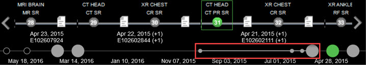 The currently displayed part of the patient timeline is represented by a slightly thicker line on the heatmap.
